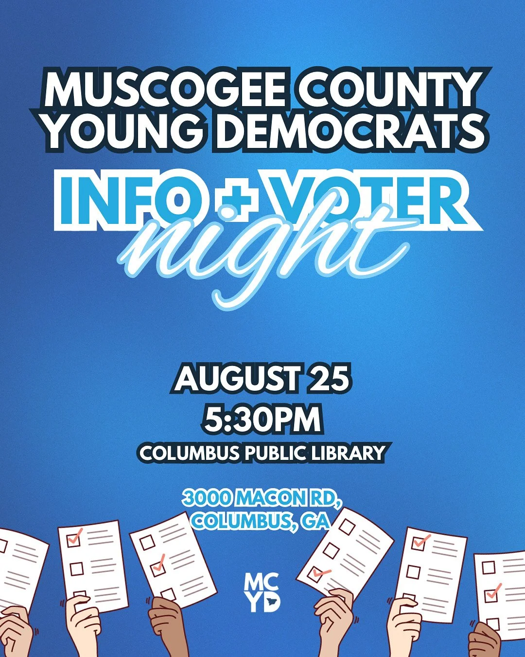Join the Muscogee County Young Democrats for our October General Body Meeting! This month’s meeting will feature special guests who will share updates and insights on issues that matter most to young people in Muscogee County.