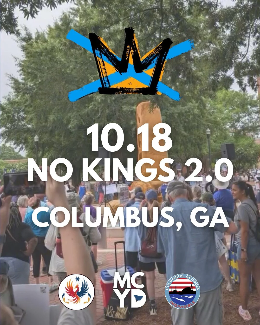 Join us for No Kings 2.0, a community-driven event focused on civic engagement, grassroots organizing, and empowering local voices. The program will open with remarks from Samuel Whitt, President of the Muscogee County Young Democrats, followed by a series of discussions and activities led by local leaders and advocates.